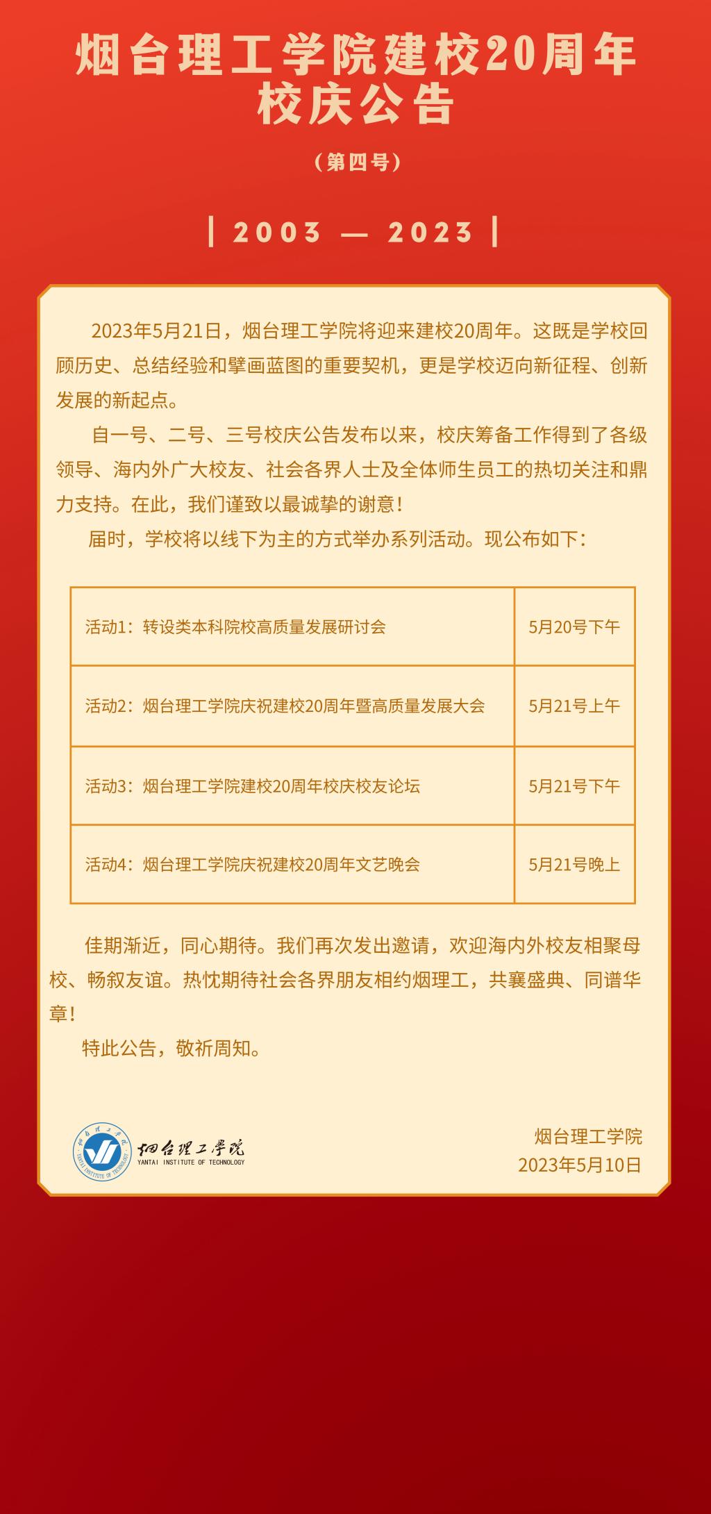 烟台理工学院建校20周年校庆公告(第四号)