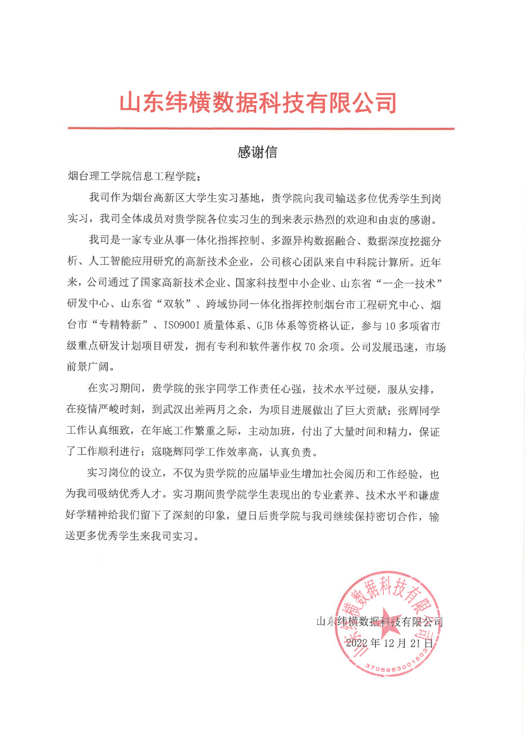 12月21日,信息工程学院收到一封来自山东纬横数据科技有限公司的感谢信。信中对学院张宇、张辉、寇晓辉三位同学在公司实习期间表现出的专业素养、技术水平和谦虚好学精神给予了高度肯定和赞扬,同时向学院输送多位优秀学生到岗实习表示热烈的欢迎和由衷的感谢。